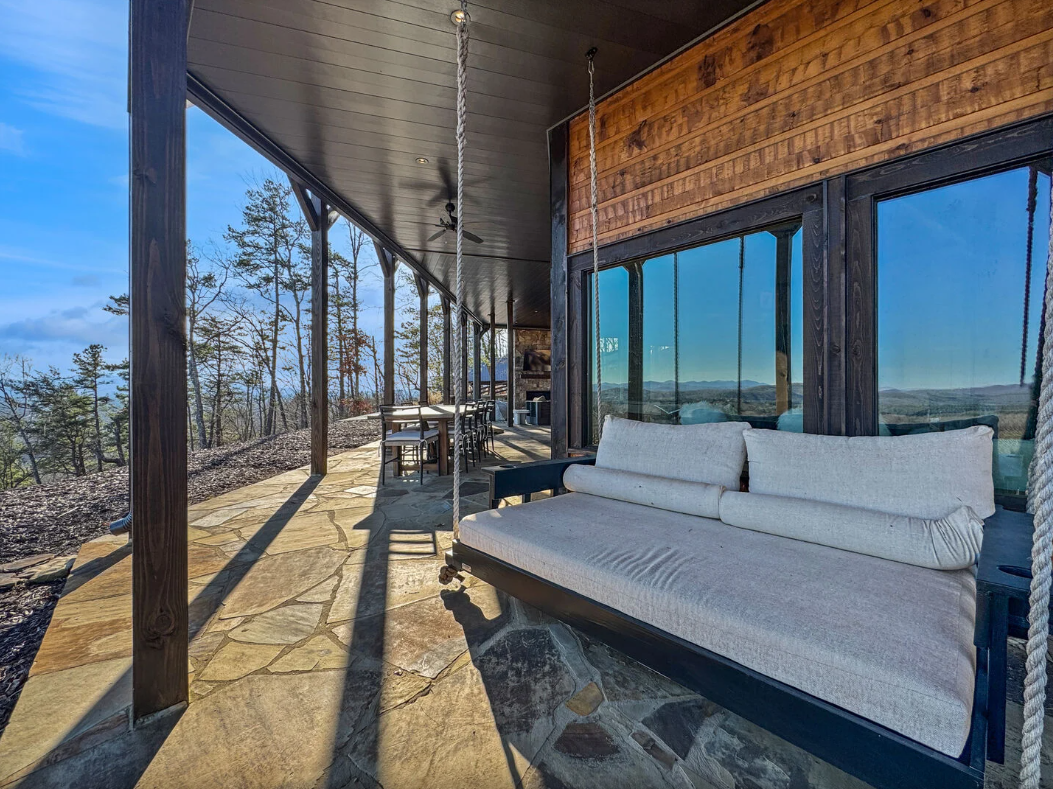 Ortho Vista is a striking modern mountain retreat where bold design meets unforgettable scenery. Set high among the treetops, this professionally decorated four-bedroom escape offers jaw-dropping, long-range mountain views that command your attention the moment you arrive. Every space feels intentional—elevated, refined, and designed to impress while still inviting you to truly relax. Outdoor living is where Ortho Vista truly shines. The main-level covered deck feels like an outdoor living room, complete with a wood-burning fireplace, oversized TV, sectional seating, rocking chairs, and a built-in grill—perfect for evenings spent watching the sky change color over the mountains. Below, the lower patio offers an entirely different pace: a daybed swing for afternoon naps, a hot tub for soaking under the stars, a dining table for al fresco meals, and another fireplace to keep the evenings cozy.