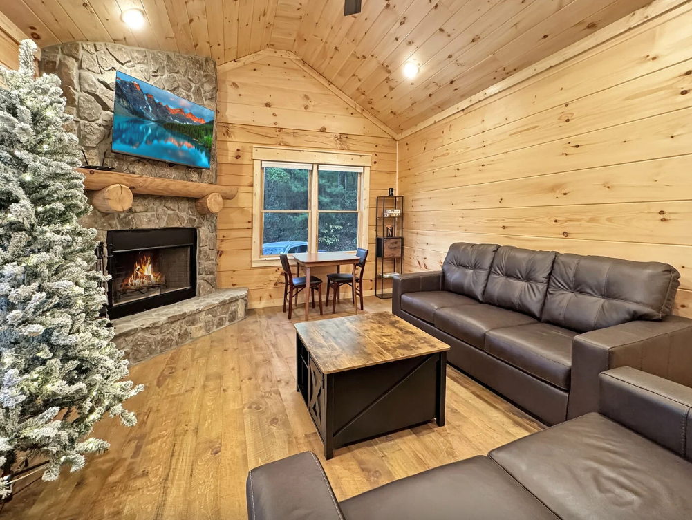 Here you can relax and sip your morning coffee or evening wine on the expansive deck while the mountains fade into hues of pink and gold at sunset. The sounds of the forest, the crisp mountain air, and the peaceful setting make it easy to relax and reconnect. And when you step inside you’ll be welcomed by warm wood interiors and inviting mountain décor. The open-concept living area invites relaxation, complete with plush seating, a Smart TV, and a crackling fireplace; the perfect spot to cuddle up with your furry friend and unwind after a day of exploring Blue Ridge. Whether you’re here for a romantic getaway, a family retreat, or simply to take in the view, Mountain View Retreat offers the perfect blend of comfort, charm, and mountain serenity for the whole family.