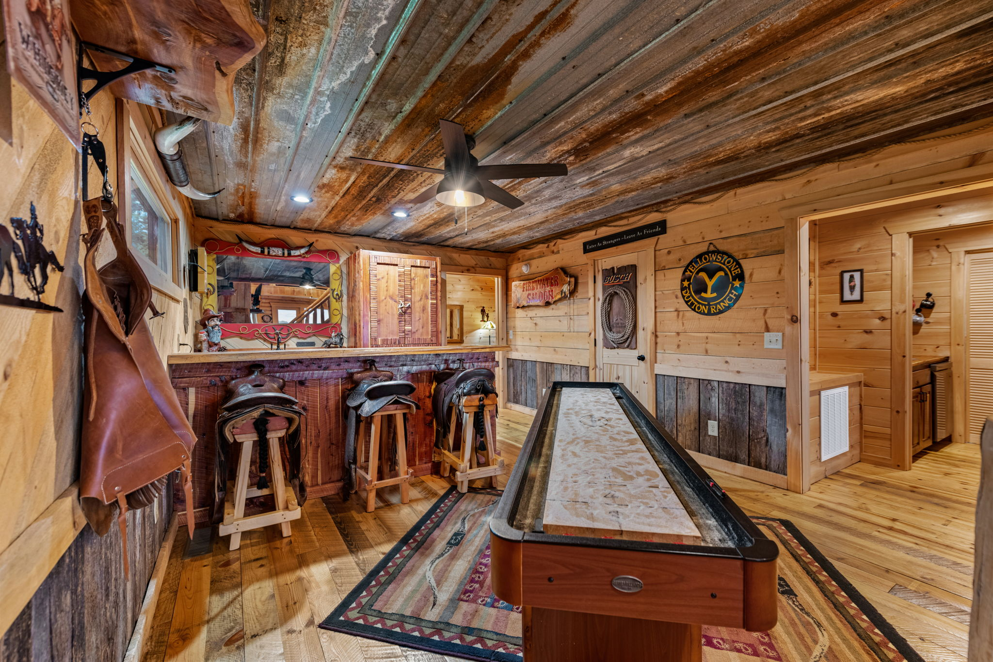 And the western saloon themed game room deserves mentioning! Cherokee Vista’s game room has 3 bar stools made of hand tooled saddles, complete with stirrups for easy on and off, lots of authentic western saloon decor and a rusted tin roofing ceiling. You and the family will love playing darts, shuffleboard, and Blue Ridge Monopoly in this one of a kind game room!