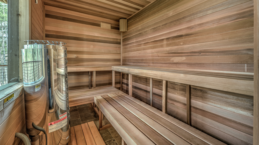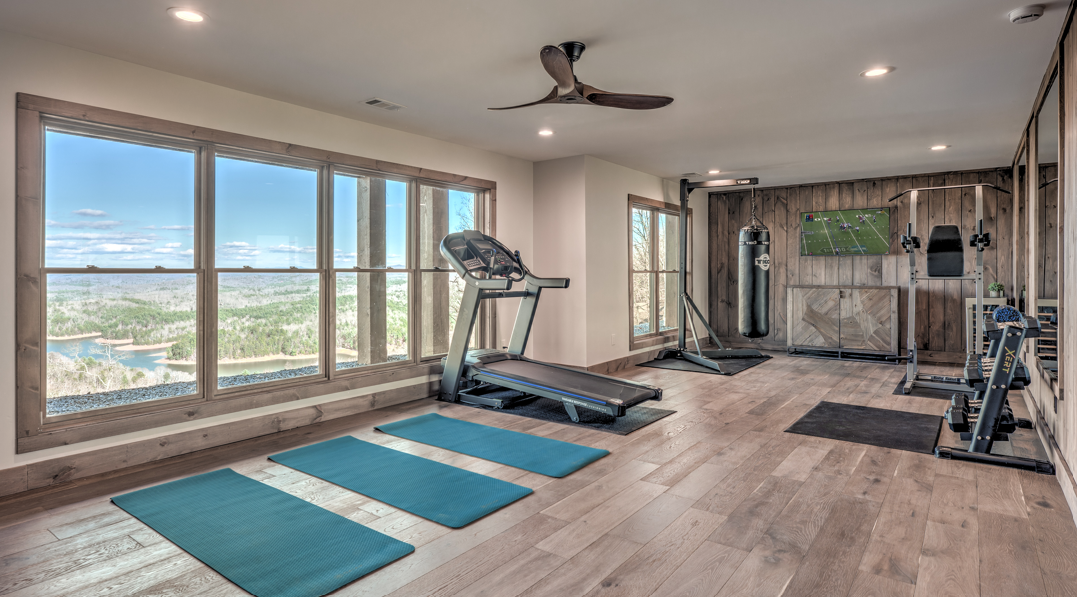 Don’t miss a second of the mountain scenery with BLUESTONE’s impressive outdoor kitchen, complete with a gas grill, fridge, and sink; allowing you to prepare gourmet meals amid the great outdoors. And in between meal times & sightseeing, sneak in a quick workout at the on-site fitness studio. This in-home gym has everything you need for the ultimate workout; a treadmill, punching bag, power tower, weights, yoga mats, floor to ceiling framed mirrors, a 50” Smart TV, mini fridge, and uninterrupted views of Lake Blue Ridge and Mountains. Get your heart racing and your blood pumping in style, without ever leaving the cabin!