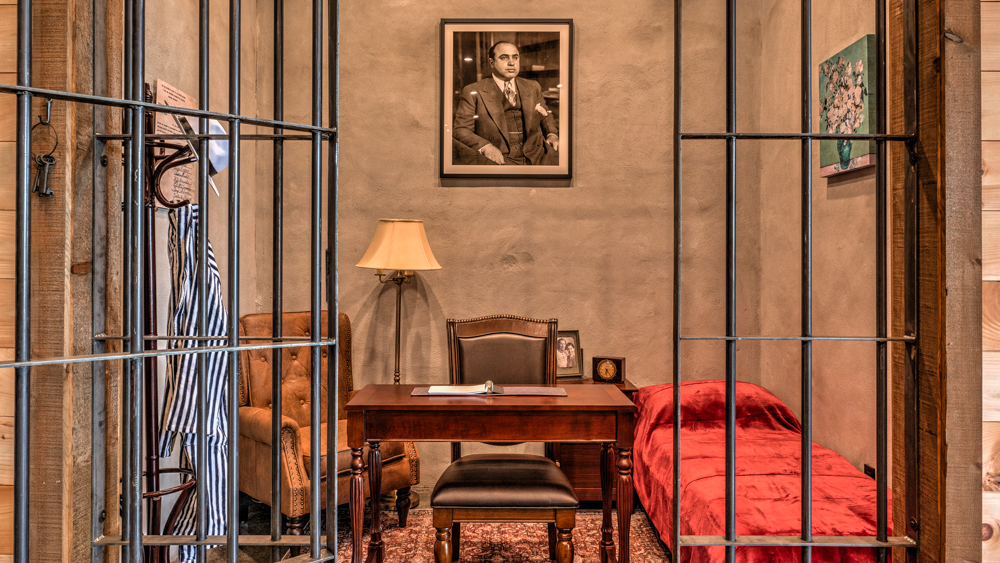 Step into the lower level speakeasy and be instantly transported back in time, to the Prohibition era. Enjoy a cocktail at the custom bar or sink into a cozy chair with a deck of cards and a story to share. For the true history buffs, a replica of Al Capone's prison cell, including all the authentic details, and a peek into his ledger, offers a truly unique photo op! And the centerpiece of the downstairs speakeasy? A Most Wanted wall that challenges guests to identify faces like Al Capone, Lucky Luciano, and other notorious criminals of the era. Whether you’re a history buff, a lover of luxury, or simply someone who craves a truly unique getaway, Old Chicago promises to be an experience you’ll never forget.