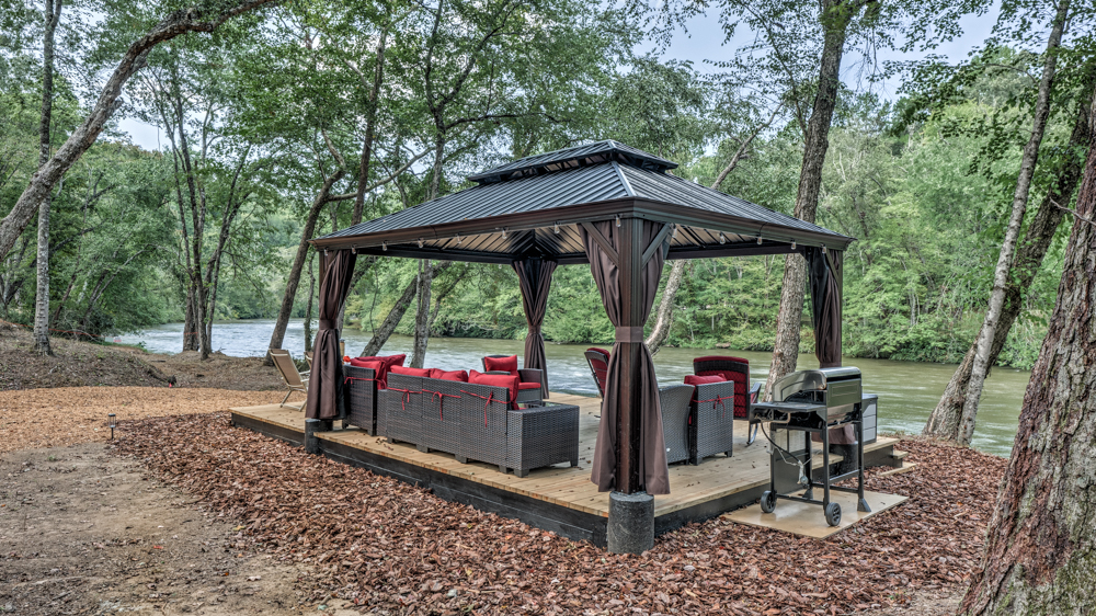 For outdoor enthusiasts, Luxury Lodge on the Toccoa offers trout and fly fishing just steps away. And for those looking for a more relaxing outdoor activity; unwind at the outdoor pavilion just steps from the Toccoa River. Lay back in one of the lounge or wicker chairs, as you listen to the peaceful sounds of the Toccoa River rushing by. Cook up your favorites on the gas grill, and then end your night roasting s'mores and swapping stories around the firepit. With room for up to 12 guests, this luxurious retreat offers ample space for friends and family to relax and enjoy all the comforts of riverside living.