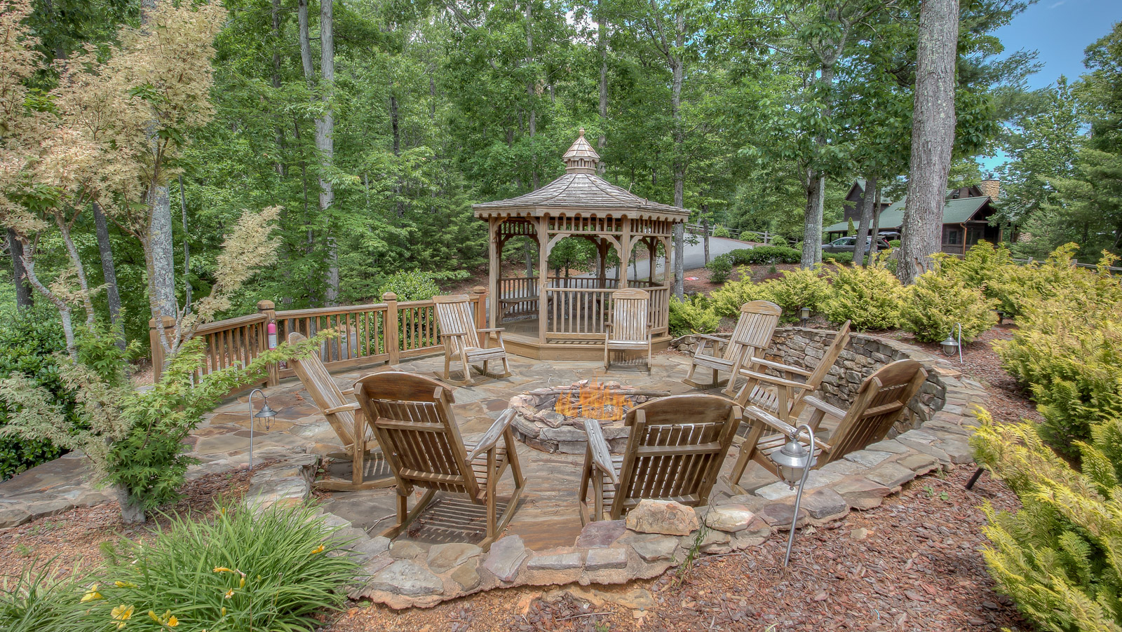 One aspect that makes Endless Echo stand out is its stunning & full outdoor spaces and amenities. Venture down into the lush garden where you’ll discover fruit trees, a vegetable and herb patch accented by playful sculptures, a picnic table, and a fire pit with bench seating for 8–10 guests. Nearby, a quiet nook by the azalea garden and bench swing offers a peaceful spot to unwind near the quaint shed porch. And on the covered decks, you’ll find plush lounge seating, rocking chairs, a bench swing, a gas grill, and multiple dining and side tables—plus a six-person hot tub overlooking the woods and garden, all illuminated by cozy string lights for the perfect evening vibe. Whether you're gathering with family or friends, it’s the perfect place to slow down, soak in nature, and make unforgettable mountain memories.