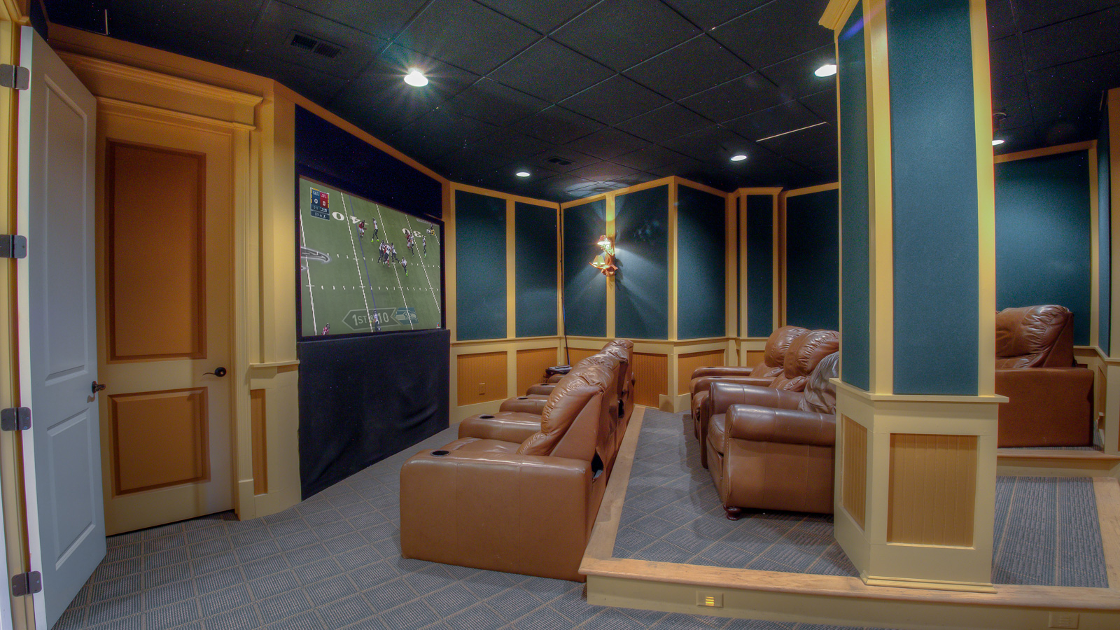 Here you can relax with a cocktail from the wet bar, curling up by the outdoor fireplace, or taking a soak in the hot tub under the stars. Out back, you’ll find a fully stocked trout stream; perfect for a peaceful day of fishing or just a scenic spot to unwind. Legend even has its own cinema screening room downstairs, complete with stadium seating — it doesn't get any closer to an authentic movie theater experience than this! Complete with a 100" projection screen TV, surround sound with acoustic panels, and 8 leather theater loungers with drink holders you’ll have everything you need for the perfect movie night! Make some popcorn, grab drinks at the nearby kitchen and bar, then everyone can sink into sumptuous loungers and enjoy a great movie up on the big screen. Whether you’re gathering with family or friends, your stay at Legend cabin is sure to be nothing short of legendary.