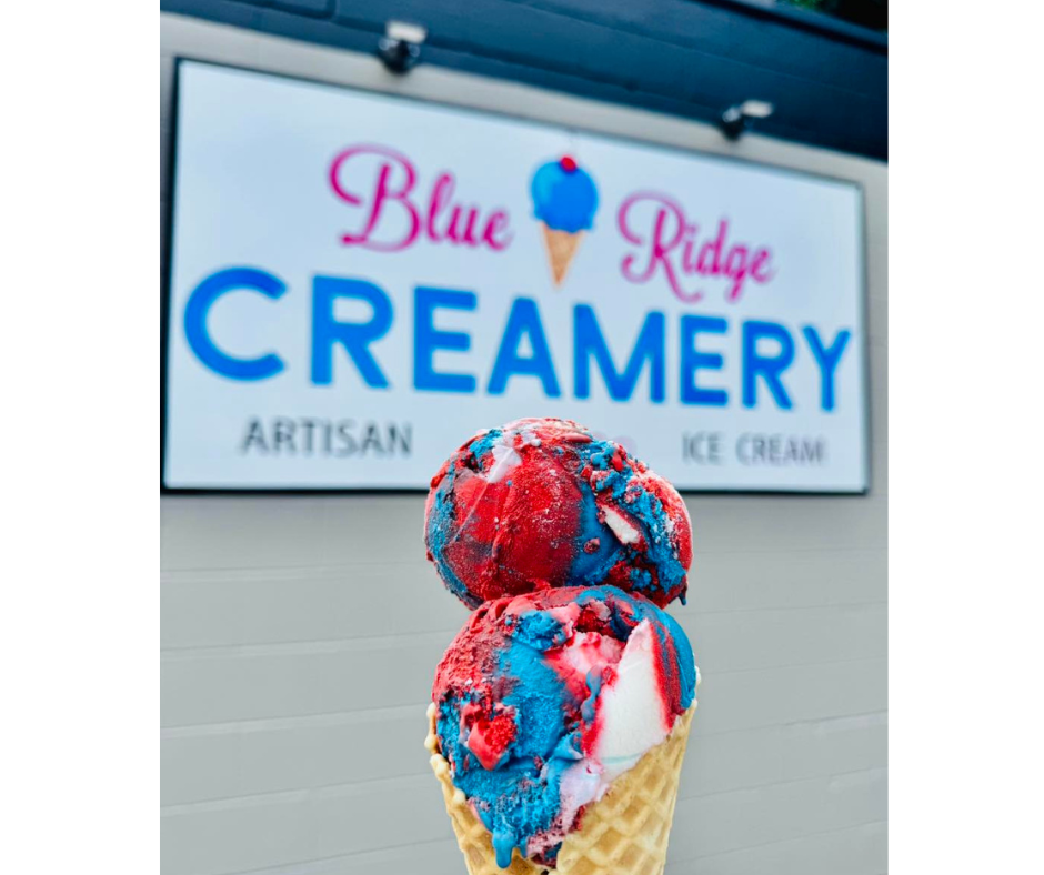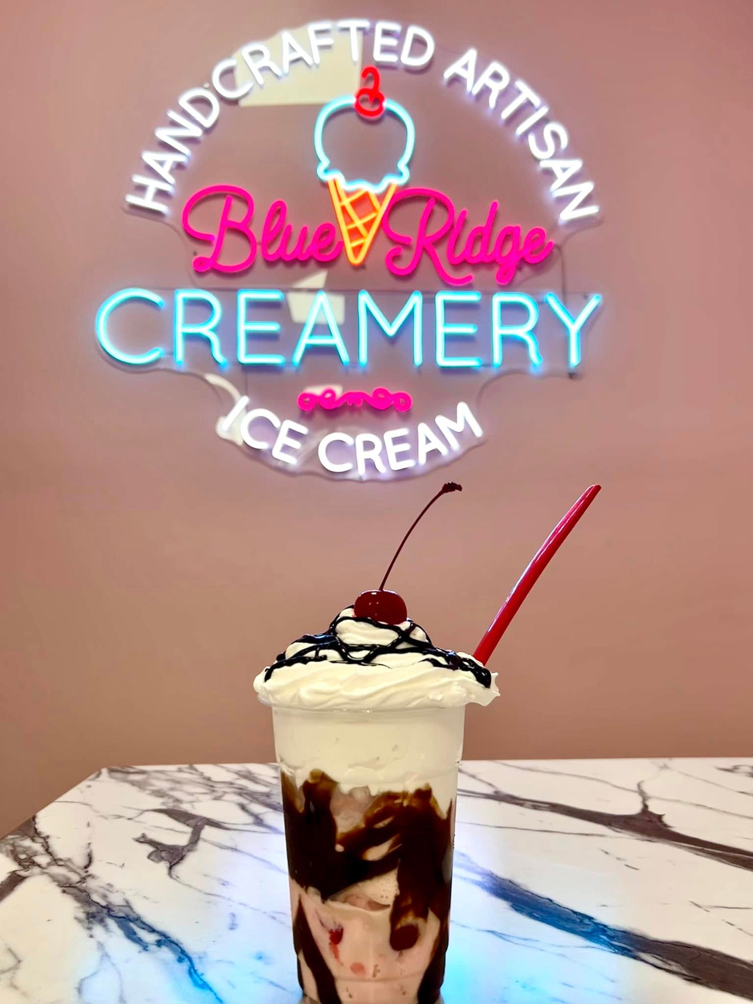 Welcome to Blue Ridge Creamery; one of Blue Ridge’s newest ice cream spots! Blue Ridge Creamery is a locally owned and passionately crafted artisan ice cream shop in the heart of Blue Ridge, Georgia. Each ice cream batch is handcrafted with love and uses sustainable ingredients. And with a HUGE selection of flavors to choose from (over 36 steady options and more than 150 rotating options) you’ll never run out of new flavors to try! Can’t decide on an ice cream flavor? Try an ice cream flight and enjoy four individual scoops of ice cream of your choice, served on a flight board. And Blue Ridge Creamery also offers milkshakes, sundaes, ice cream floats, ice cream sandwiches, and more sweet treats! Be sure to stop in and take a picture of your favorite flavor ice cream in front of their fun neon sign!