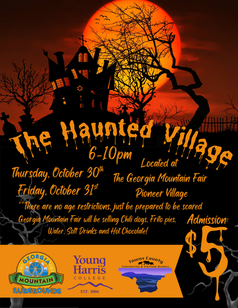 Hiawassee has it’s own Halloween fun at the Georgia Mountain Fairgrounds on October 30th & 31st. There will be a haunted village set up in the Pioneer Village on Thursday & Friday night, and trick or treating fun on Halloween night! It’s going to be a spooktacular week at the Fairgrounds!