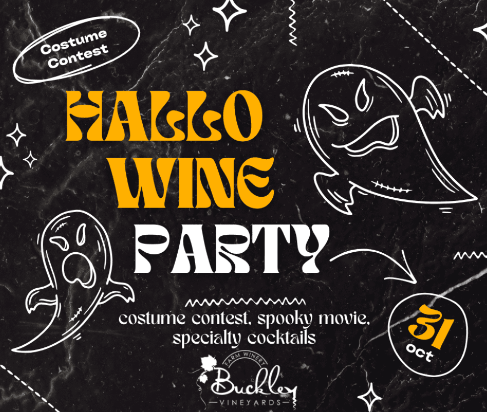 Raise a glass for Buckley Vineyards 4th Annual HalloWINE Party on Halloween night! The party will include a costume contest, a spooky movie on the big screen, Hallo-WINE cocktails, and of course plenty of wine. Party under the stars from 6pm-9:30pm at Buckley Vineyards!