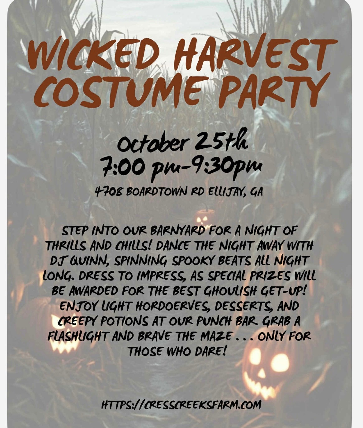 Enjoy a spooky night of fun at Cress Creeks Farm on October 25th! Dress in your Halloween best and enjoy light hordoerves, desserts and creepy potions at our punch bar, grab a flashlight and brave the maze, only for those who dare! plus music from DJ Quinn!