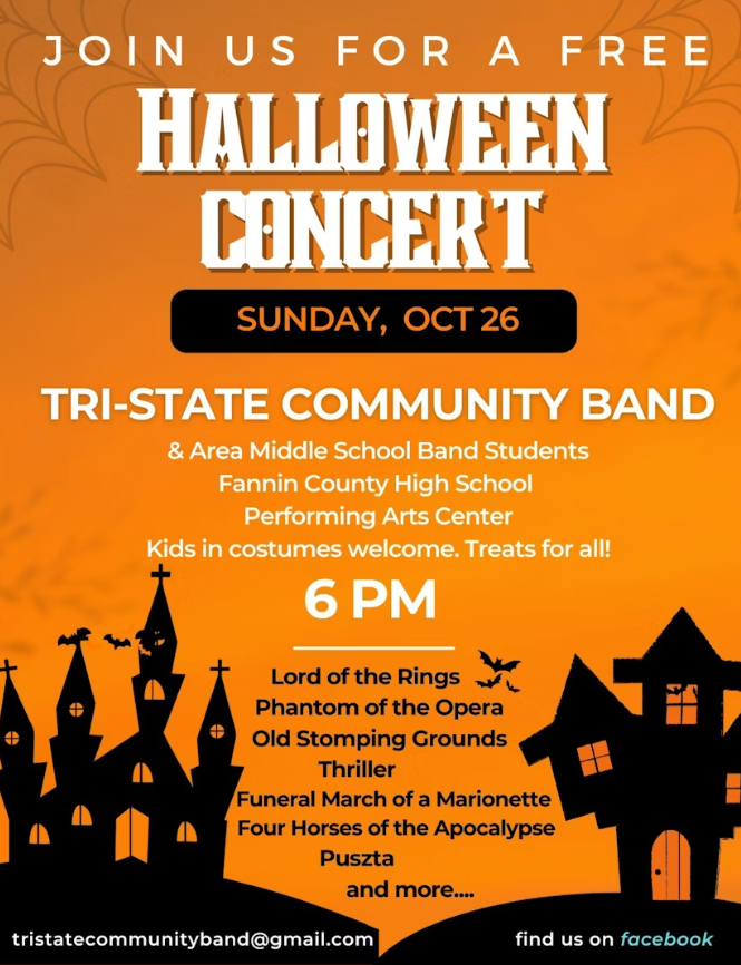 The Tri-State Community Band and area Middle School Band Students will be performing a Halloween Concert at Fannin County High School at 6pm on Sunday, October 26th. There will be music from Lord of the Rings, Phantom of the Opera, Old Stomping Grounds, Thriller, Funeral March of a Marionette, and so much more! Kids in costume are welcome and treats are available for all!