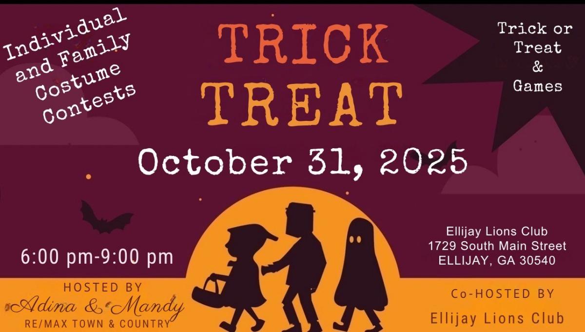 Come on out for trick or treating fun at the Ellijay Lions Club on Halloween! There will be candy, games, and a costume contest for both families and individuals. Bring the kids out and have a great time from 6pm-9pm at the Ellijay Lions Club!