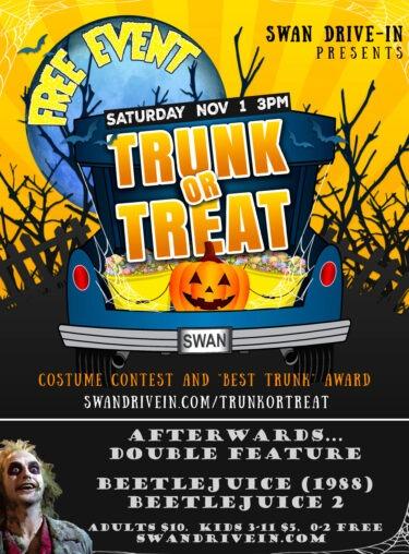 And on November 1st the Swan Drive In will be hosting a special Trunk or Treat event before the Beetlejuice double feature. At 1pm set up begins for those participating in the trunk or treat decorating contest and trick or treating begins at 3pm. Then at 4:30pm winners will be announced for the best costume and best trunk decorations. Come on out for this fun, free Halloween event!
